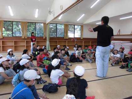 入所式の後,オリエンテーションで「みさきの家」の所員の方からお話を聞きました。この後,所内オリエンテーリングをしてから夜はキャンプファイヤーです。