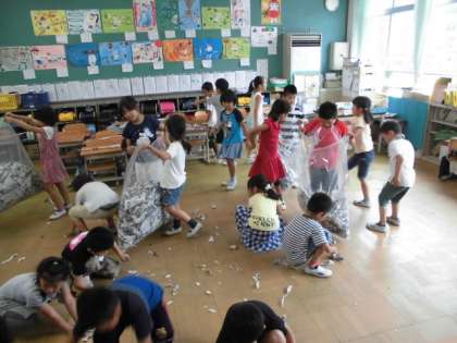 新聞紙でおめんを作って楽しむ子もいました。最後は,教室の真ん中にふかふかの「新聞紙山」を作り,袋の中に入れていきました。(もちろん,「新聞紙山」に飛び込む子もたくさんいました)袋に全部詰めおわると,教室は元通り。とても楽しい2時間になりました。