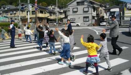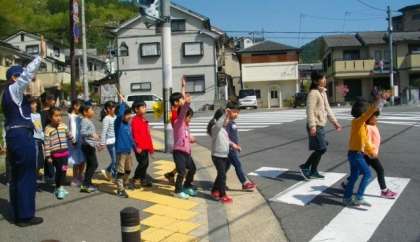 外に出て,横断歩道のわたり方を練習しています。