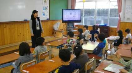 1年生はしっかりお話を聞いています。4年生は朝に新出漢字の練習をしていました。