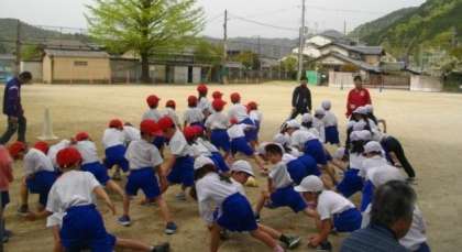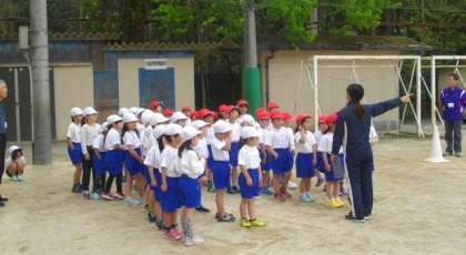 1年生が体育で50m走に挑戦しています。準備運動を念入りにしてから,走っています。