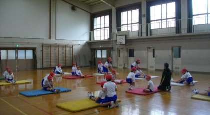 5年生が体育館でマット運動に取り組んでいます。最初は二人組で柔軟体操をしています。