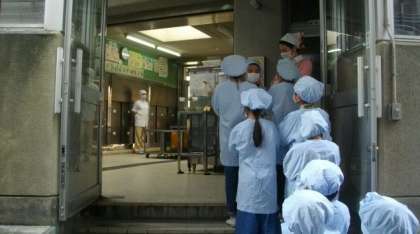 給食室の前で,あいさつをして手の消毒をしてから,食管をとりに入ります,