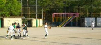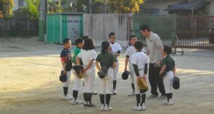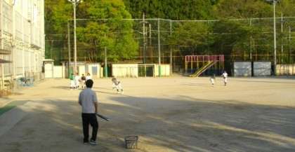 市原野イーグルスの皆さんが,学校の運動場で練習をしています。元気のよい声が響いています。