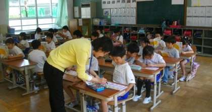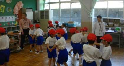 「じょうずにかけましたね。はらうところがいいですね。」先生に○をもらって,ちょっぴり照れくさそうにしているお友達もいます。1年生は,かんたんな体ほぐしの体操を歌に合わせて行っています。