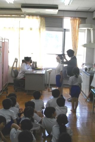 1年生が身体計測をしています。終わった後に「ありがとうございました」と先生に伝えている子どもたちがたくさんいました。