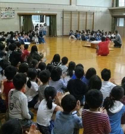 3校時,1年生を迎える会を行いました。1年生が5年生と手をつないで入場。跳び箱の上で名前を言ってハイポーズ。