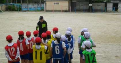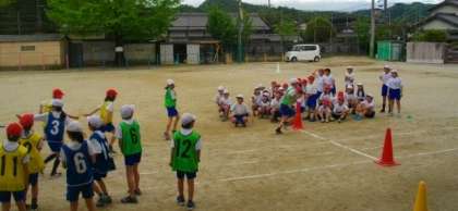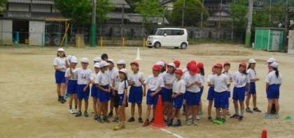 5年生がリレーの学習をしています。バトンパスの仕方を工夫しています。