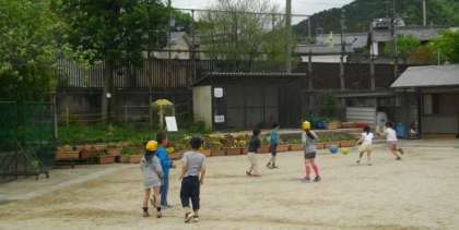 放課後,低学年の子どもたちがソフトドッジボールで遊んでいます。