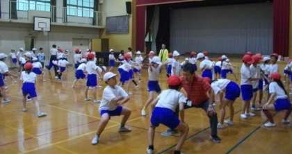 3,4年生は,運動会で披露するソーラン節の練習を始めました。迫力ある演技になるように,型の練習をしています。
