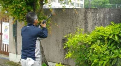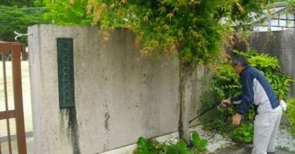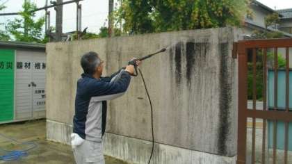 高圧洗浄機で,壁の汚れを落としていきます。今日は校門の南側部分を中心に作業をしました。黒ずみがとれて,少しずつ明るい雰囲気になってきました。