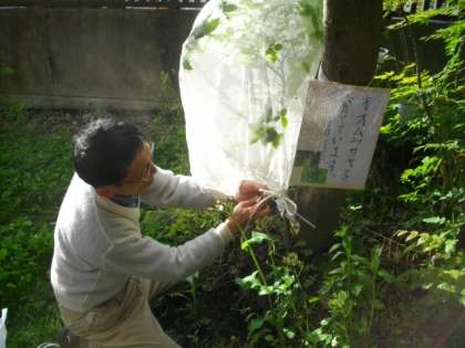 地域の方が,オオムラサキの幼虫を持ってきてくださいました。校内にあるエノキの木に幼虫をつけていただき,ネットをかけていただきました。ありがとうございました。