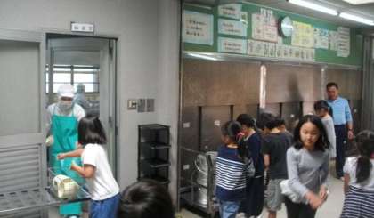 給食室に食管や食器を返却にきました。