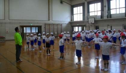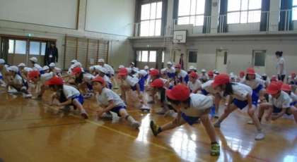 3,4年生が運動会にむけて,集団演技の練習をしています。けがのないように,念入りにストレッチをしてから始めます。