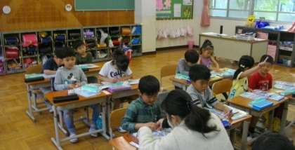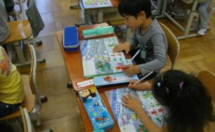 1年生は算数で,数図ブロックを使って学習しています。一つ一つ丁寧においています。