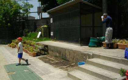 運動場では,1,2年生が集団演技の練習をしています。その横では,管理用務員さんが,プランターの整備を進めています。