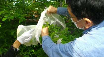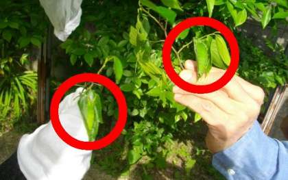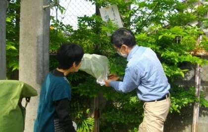 オオムラサキの幼虫をエノキの木につけに来てくださいました。5月末にはさなぎになることと思います。今回は運動場の南端の木につけていただきました。(合計,校内には2ケ所つけていただきました。)