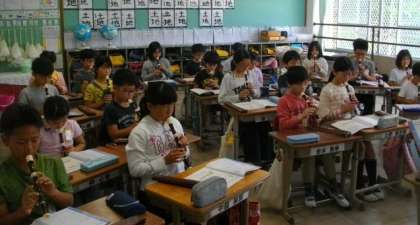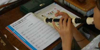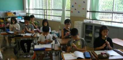 5年生が,音楽でリコーダーの練習をしています。美しい二部合奏ができました。