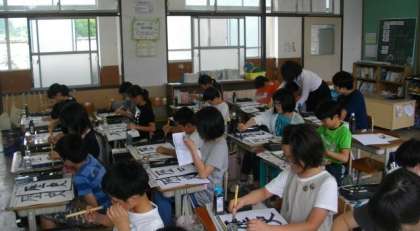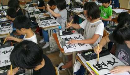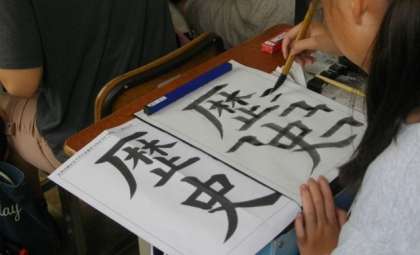習字で「歴史」の文字を書いています。とめやはらいの練習を集中して何回もしています。勢いのある字が書けています。