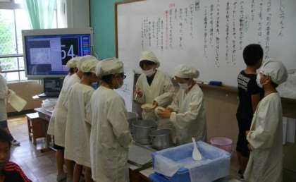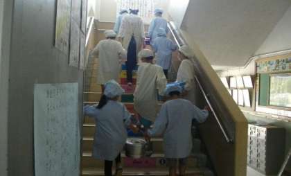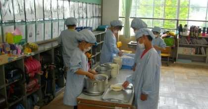 4時間目が終わると,各クラスでは給食の準備が始まります。