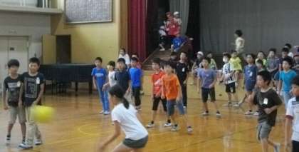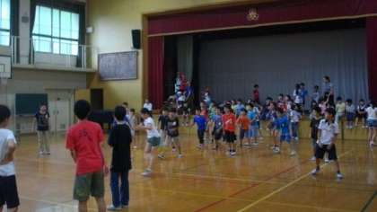 今日は雨が降っているので,外で遊ぶことができません。運動委員会が,体育館で体を動かすことができるように「雨の日大会」を開いてくれました。