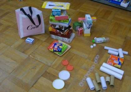 1年生は,算数科で身の回りのもので同じ形のもの同士を集める活動をしています