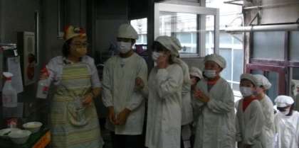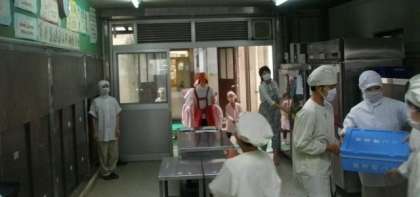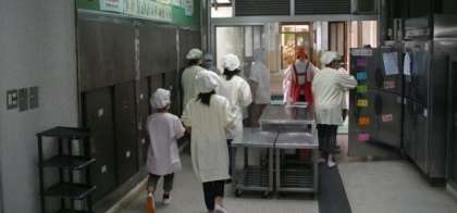 サービスホールの前に整列して,健康チェックをしたあと,手を消毒し「いただきます」。