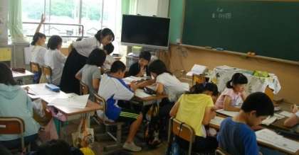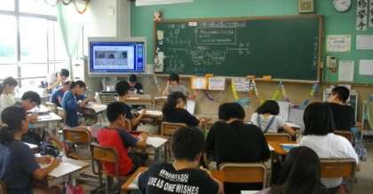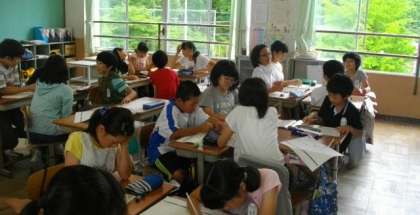 6年生は,家庭科で話し合いをしています。算数科では,分数の問題を解くために,自分なりに考えた方法をノートに記してから話し合いをしています。