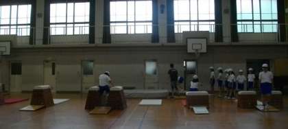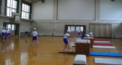 6年生が体育の跳び箱でいろいろな跳び方に挑戦しています。