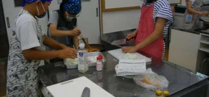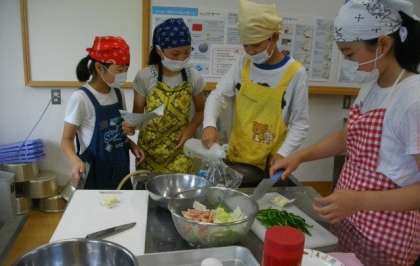 朝食のおかず作りで,食品の組み合わせや材料に応じた炒め方について考えたり,工夫したりできるようにしています。たまねぎやピーマンの切り方にも工夫をしています。