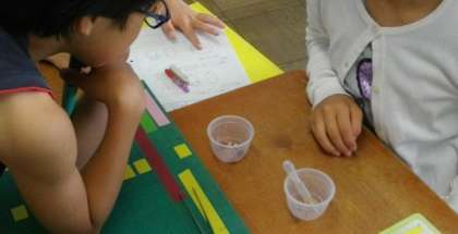 3組は,朝一番にサーキットトレーニングをしています。5年生は,植物の種に栄養があるかどうかを薬品を使って調べています。