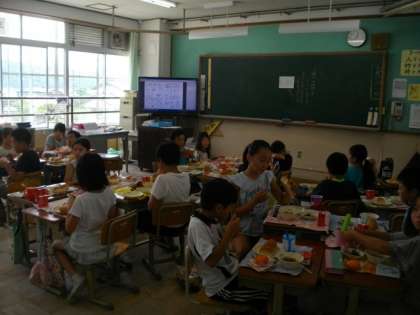 今日の給食のメニューは,ほうれんそうのソテー,チリコンカーン,あじつけコッペパン,みかん,牛乳です。おいしそうに食べています。