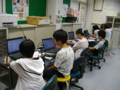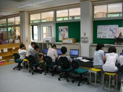 6年生が,コンピュータ室で,コンピュータの操作方法について学んでいます。パンフレット作りをするために,プレゼンテーションソフトの使い方や文字入力の仕方を一斉送信画面を見ながら,再確認しています。