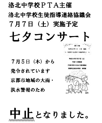 7月7日(土)に予定されていましたPTA主催七夕コンサートについては「中止」との連絡が届きましたので,お知らせします。
