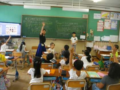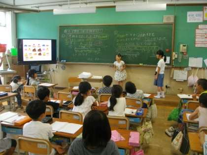2年生が,算数の学習をしています。テープ図を使って,「はじめの数」「残った数」を表し,足し算にするのか引き算にするのかを話し合っています。
