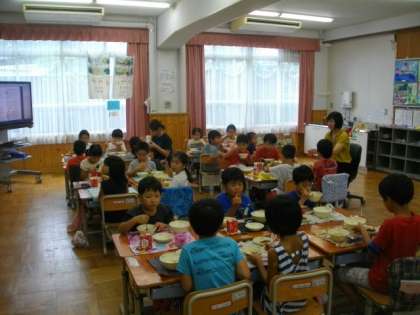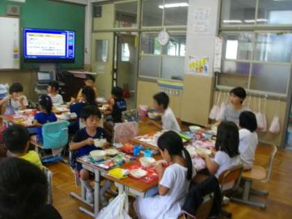 今日の給食の時間には,市原野小学校の教職員がいろいろな教室にはいって,一緒に給食を食べました。