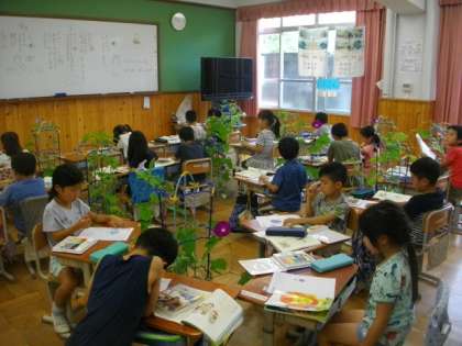 1年生も国語でかんさつ日記をつけています。形やいろ,においなど,いろいろなことばを使いながら書いています。また,「つるがながい」には,「こくばんのたかさくらい」といったことばを付け足すなど,書き方の工夫もしています。
