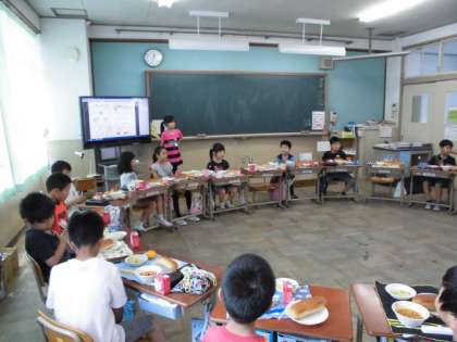 3年生がクラス全員で円を作って,楽しく給食を食べていました。