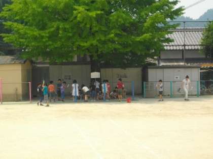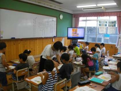4年生は,運動場で,理科実験をしています。1年生は,音読の工夫について学習しています。