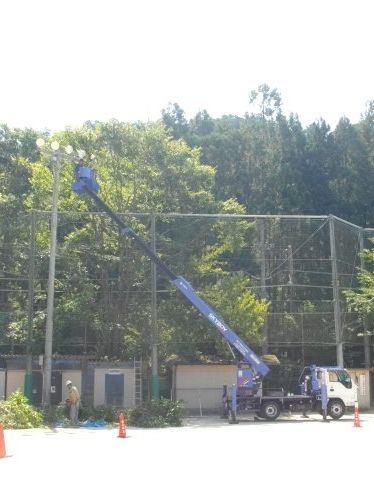 ナイター設備や電柱にかかっている高い樹木の枝等を順次剪定していただいています。