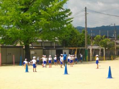 2年生は運動場で体育をしています。5年生は算数で合同な図形について学習しています。