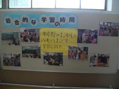 3年生と6年生が,地域の歴史や郷土に伝わる「ハモハ踊り」について学習しました。その様子を写真付きで掲示しています。