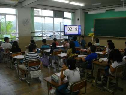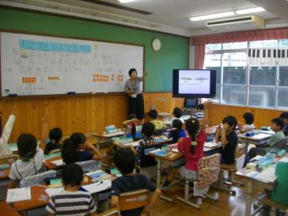 4年生は,テストを終えました。1年生は,算数科で「10といくつのたしざんをしよう」というめあてで学習をすすめています。