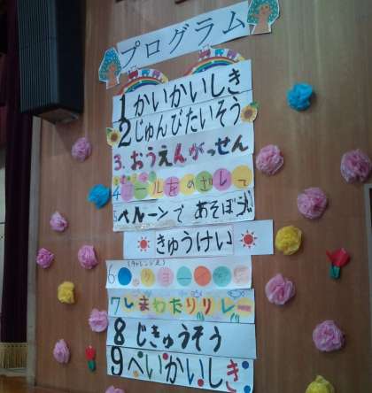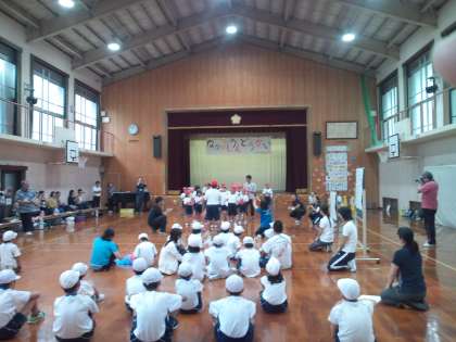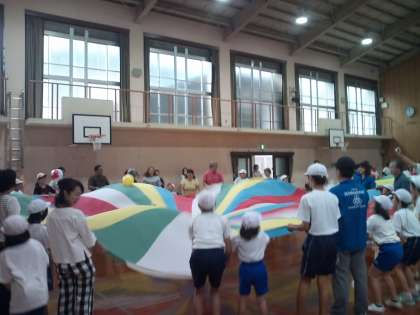 開会式のあと,準備体操をしました。バルーンで遊んだり島わたりリレーで競争をしたりしました。会場の静原小学校のお友達が,いっしょに競技をしたりサポートをしたりしてくれました。最後まで笑顔いっぱいのすてきな運動会になりました。ありがとうございました。
