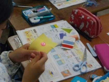 5年生は,家庭科で小物づくりに取り組んでいます。ボタンも上手につけられるようになりました。