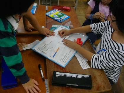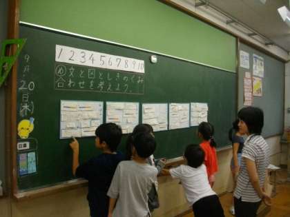 2年生が算数の学習を進めています。今日は,班ごとに話し合い,問題文とそれに対応するテープ図や説明する文,答えなどをホワイトボードに組み合わせてまとめています。