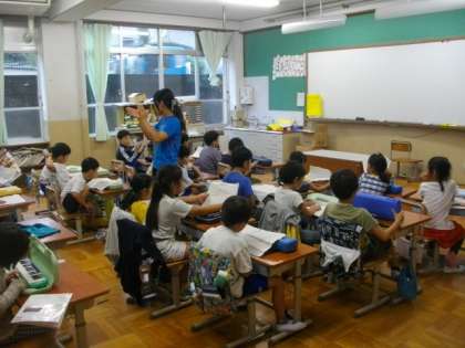 1年生が,鍵盤ハーモニカの練習をしています。4年生は,お話の絵の制作に取り組んでいます。
