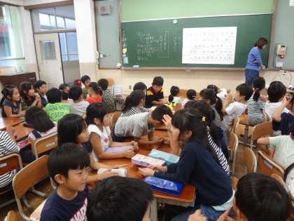 2学期から,2年生のみんなで拗音や長音を含むことば集めをはじめとする「ことばの学習」を進めています。第3回目のテーマは「つまる音を集めよう」です。“っ”がつく言葉を2人1組で探し,全員で出し合いました。「ちっぷ」や「ばっと」などのたくさんの言葉が子どもたちから出てきました。