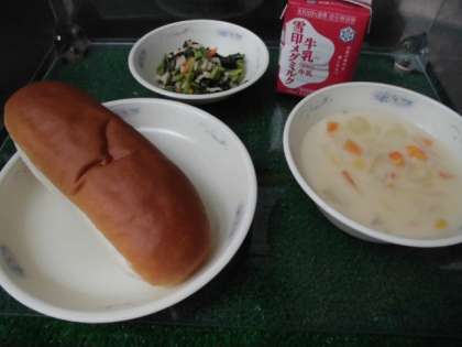 ・小松菜のソテーのチキンハムと小松菜が合っていて,とてもおいしかったです。また,コーンクリームシチューのじゃがいもが,中までシチューの味がして,おいしかったです。