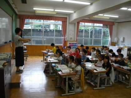 1年生は,算数でかさ調べをしています。3年生は音楽で楽しくリズムをとっています。